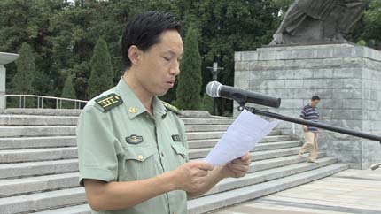我们相聚在革命烈士纪念碑前一齐欢送红色行侠阮强明出征。
